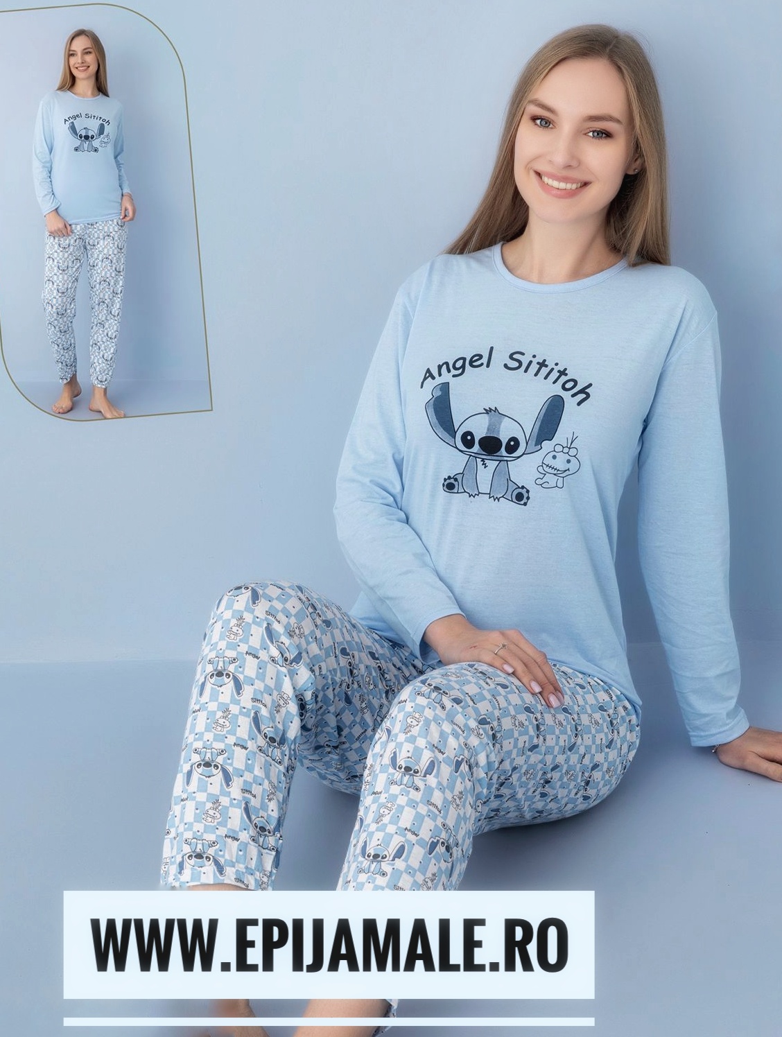 Pijama din bumbac 100%, pentru dame, BLUZA ALBASTRU DESCHIS cu imprimeu și pantalon LUNG , Cod produs PFR908