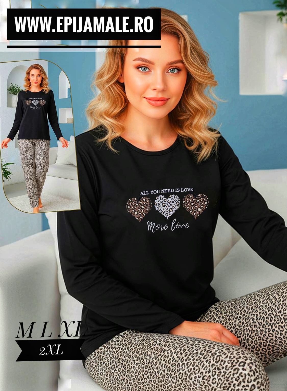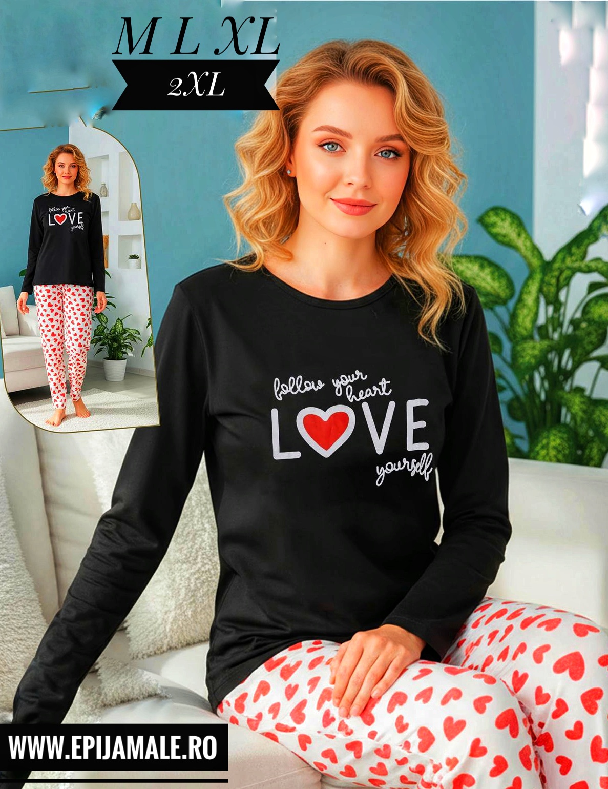 Pijama din bumbac 100%, pentru dame, BLUZA NEGRU cu imprimeu INIMIOARE și pantalon LUNG , Cod produs PFR910