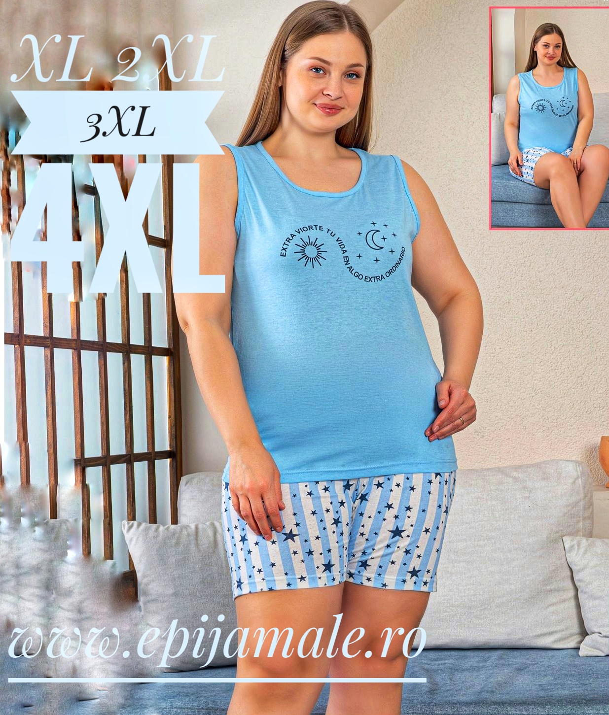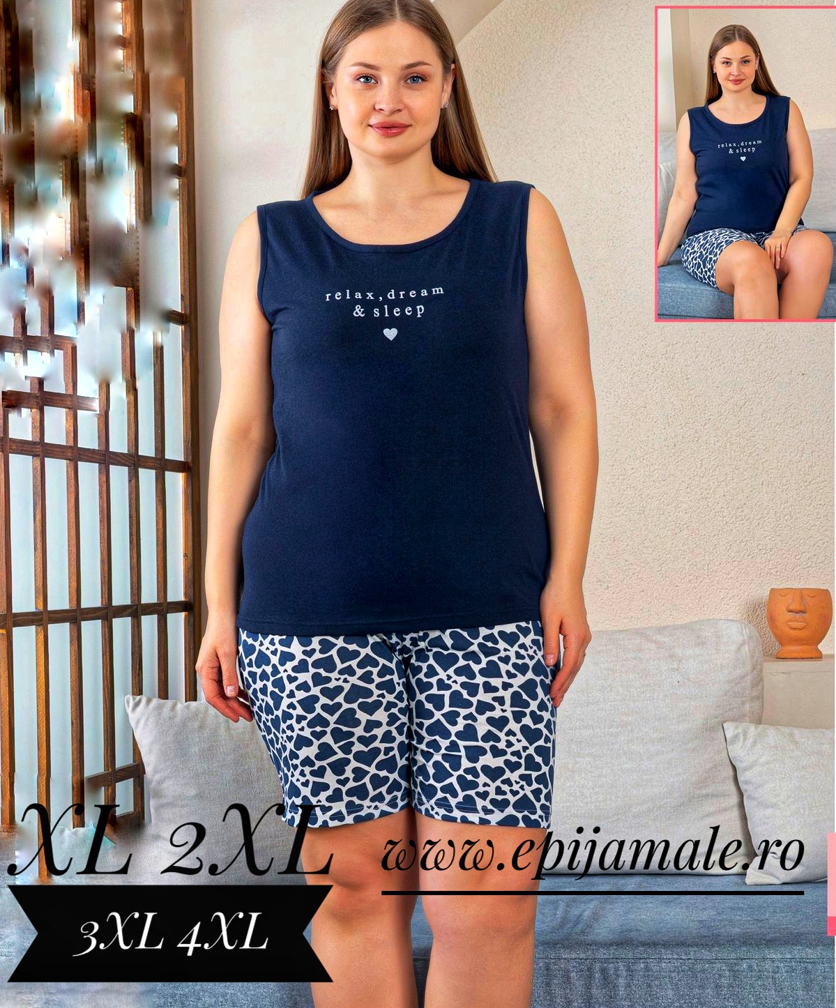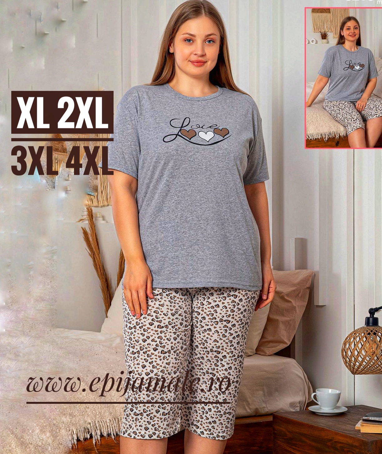 - Pijama dame, maieu cu imprimeu si pantalon scurt , croi lejer, ideale pentru un somn odihnitor!Marimi XL-2XL-3XL-4XLMetode recomandate de spalare si intretinere: