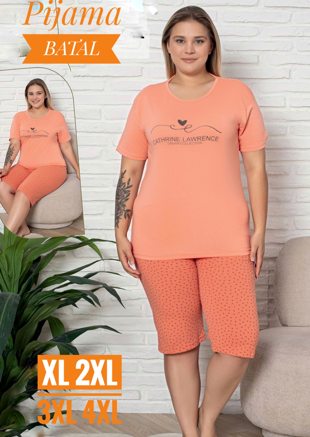 Pijama din bumbac 100% pentru dame, TRICOU PORTOCALIU cu imprimeu , pantalon TREISFERT Cod PFRV301