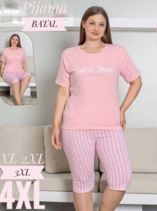 Pijama din bumbac 100% pentru dame, TRICOU ROZ cu imprimeu , pantalon TREISFERT Cod PFRV300