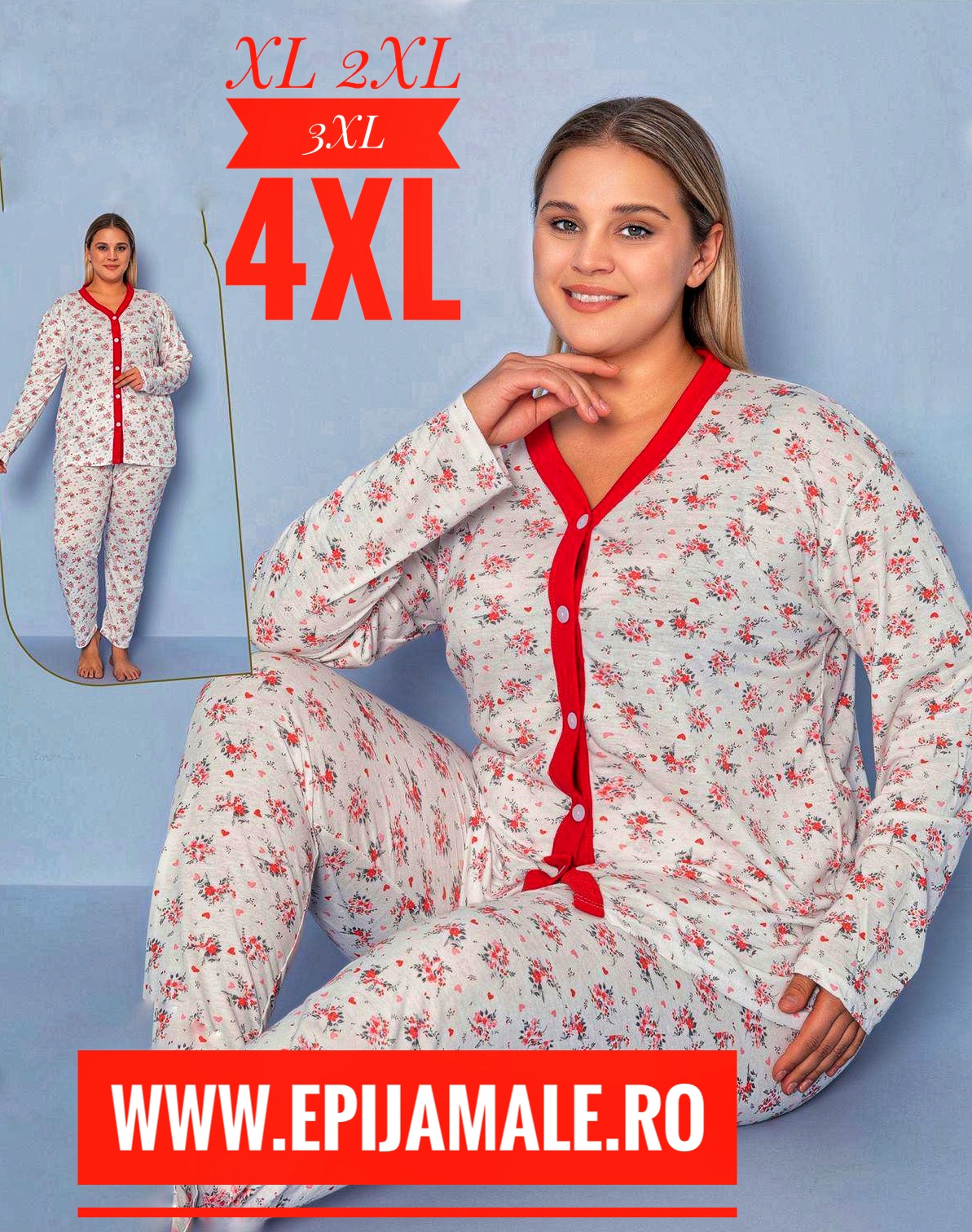 Pijamale din bumbac pentru dame, MĂRIMI MARI – BLUZA ALB cu FLORI ROZ si pantalon LUNG , Cod produs – PFRM 916