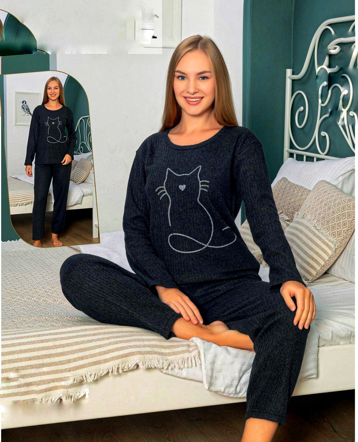 Pijamale din molton pentru dame, GROASE- BLUZA cu imprimeu PISICA , si pantalon LUNG , Cod produs PFR 1265