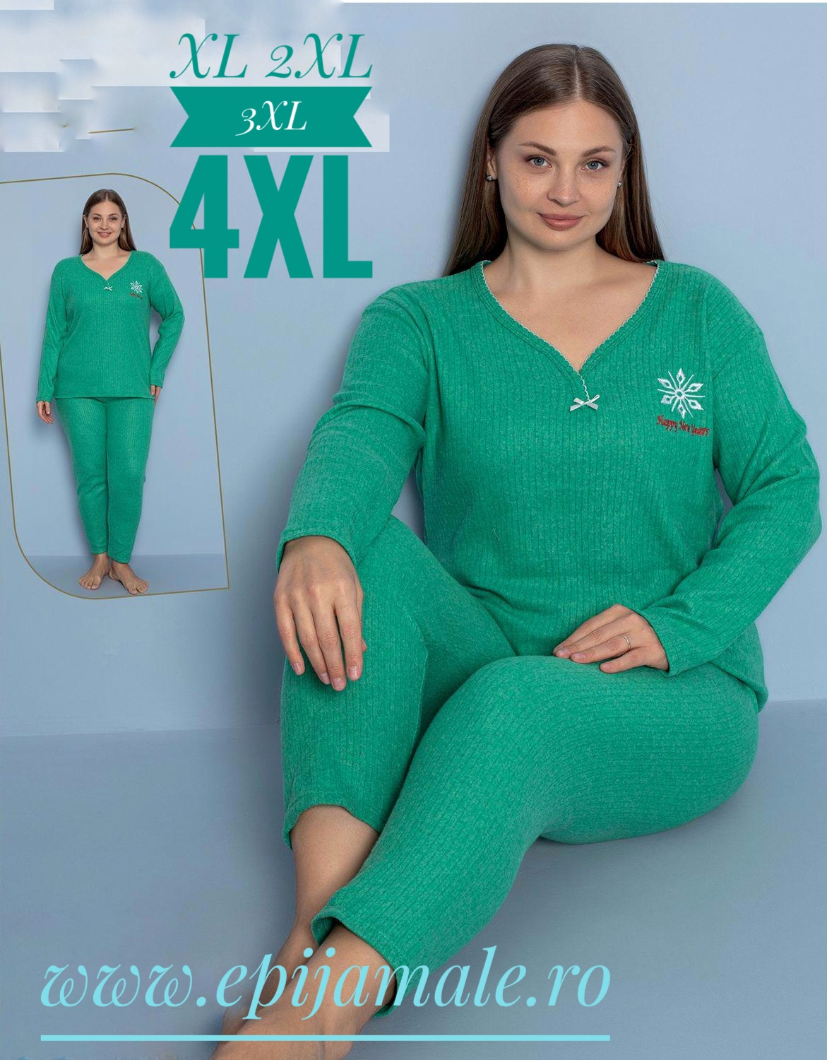 Pijamale din molton pentru dame, MĂRIMI MARI- GROASE- BLUZA VERDE cu imprimeu si pantalon LUNG , Cod produs- PFRM 906